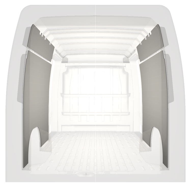 Revêtement entièrement léger pour les parois intérieures d’une Citroën Jumper / Peugeot Boxer / Fiat Ducato avec doubles portes latérales. Les parois créeront un environnement professionnel lumineux et convivial et se nettoient facilement.