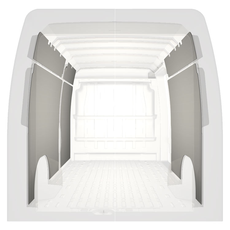 Revêtement entièrement léger pour parois intérieures d’une Citroën Jumper / Peugeot Boxer / Fiat Ducato avec une porte latérale à droite. Les revêtements créent un environnement professionnel lumineux et convivial et se nettoient facilement.