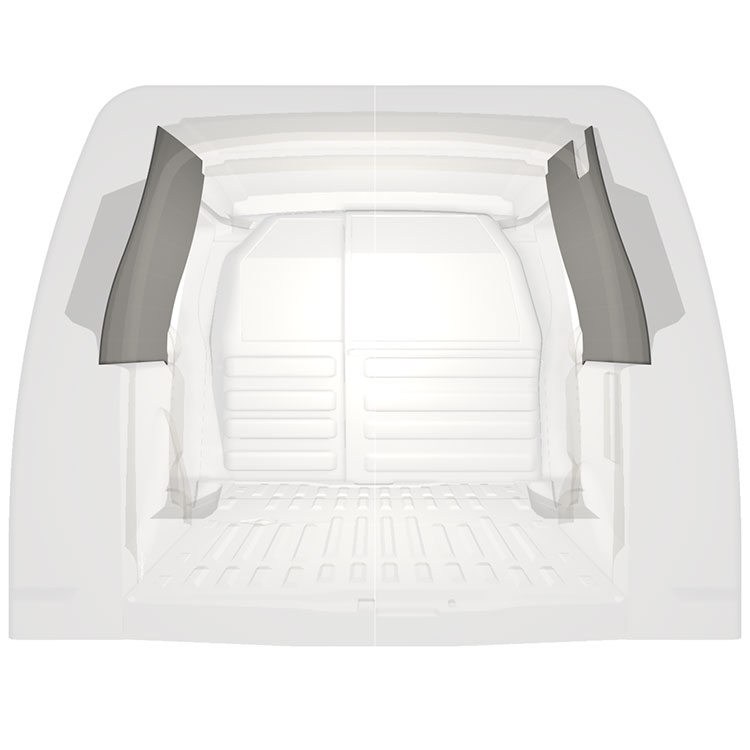 Revêtement entièrement léger pour les parois intérieures d’uneCitroën Berlingo / Peugeot Partner avec doubles portes latérales. Les parois créeront un environnement professionnel lumineux et convivial et se nettoient facilement.