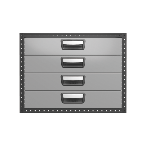 Chaque tiroir est équipé en version standard de glissières sur roulements à billes et sa charge maximale est de 30 kg, tandis que la charge totale par bloc est de 100 kg. Les tiroirs peuvent être ouverts à fond et sont équipés d'arrêtoirs. Pour une utilité maximum, le bloc-tiroirs peut être équipé d'accessoires tels que fond en mousse, séparations et casiers en plastique. Afin d'optimiser le poids, des tôles de fermeture acier et des panoplies sont disponibles en option.