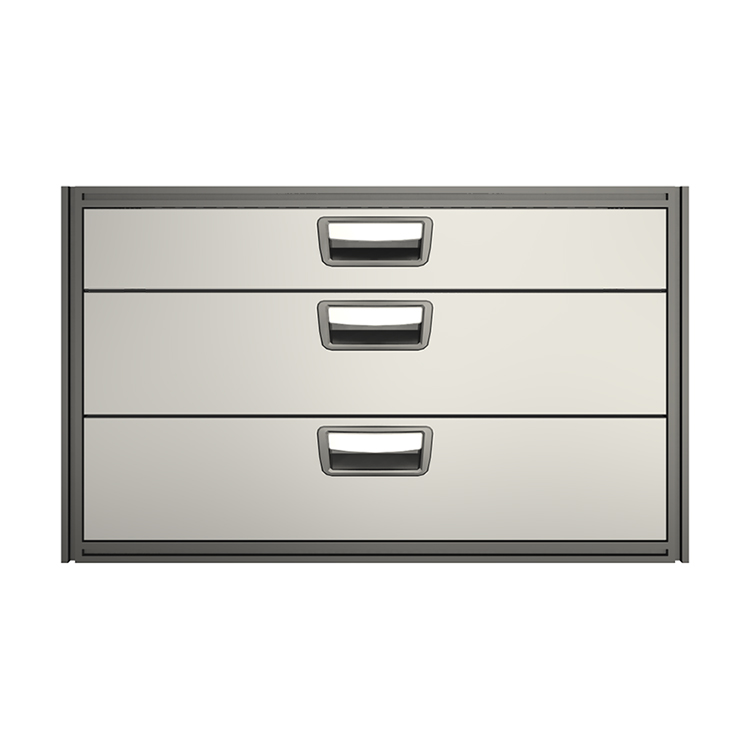 Chaque tiroir est équipé en version standard de glissières sur roulements à billes et sa charge maximale est de 30 kg, tandis que la charge totale par bloc est de 100 kg. Les tiroirs peuvent être ouverts à fond et sont équipés d'arrêtoirs. Pour une utilité maximum, le bloc-tiroirs peut être équipé d'accessoires tels que fond en mousse, séparations et casiers en plastique. Afin d'optimiser le poids, des tôles de fermeture acier et des panoplies sont disponibles en option.