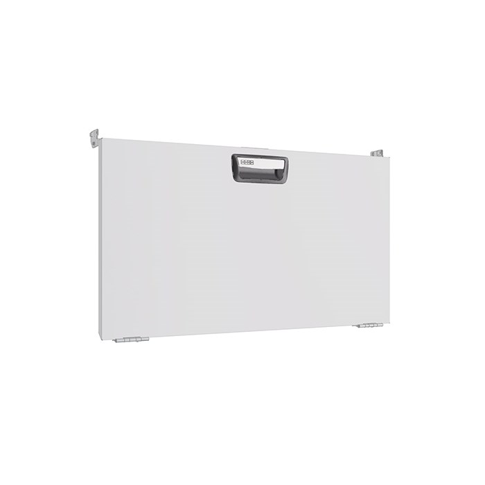 Les portes rabattables sont équipées de vérins pneumatiques des deux côtés, assurant une ouverture et une fermeture en douceur. L’angle d’ouverture est de 90 degrés. La poignée de porte est munie d'un verrouillage de sécurité intégré qui en empêche l'ouverture lorsque le véhicule est en marche. La porte est également compatible avec les cadres de passage de roue équipés de plans de travail. Le montage de portes entre deux étagères requiert l'utilisation d'un cadre de montage.