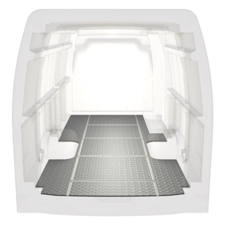 Plancher léger et robuste avec rails transversaux pour une Renault Master / Opel Movano / Nissan NV400 avec une plaque de roulement en aluminium antidérapant et des rails de chargement (longitudinaux et transversaux) pour une installation rapide et sûre des systèmes de rayonnage et autres accessoires.
