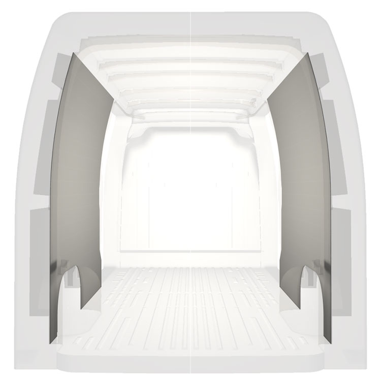 Revêtement entièrement léger pour les parois intérieures d’une Renault Master / Opel Movano / Nissan NV400 avec doubles portes latérales. Les parois créeront un environnement professionnel lumineux et convivial et se nettoient facilement.