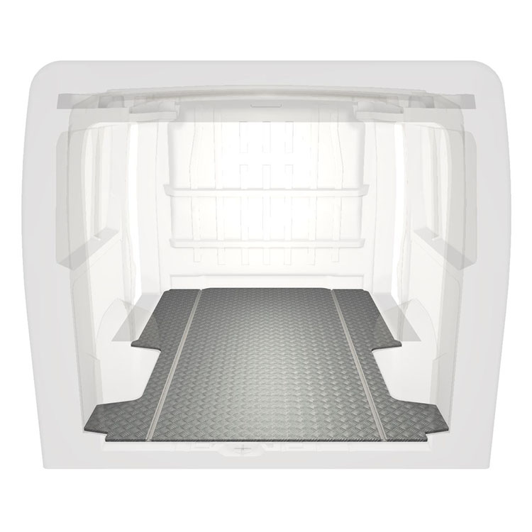 Plancher très long léger et robuste pour une Citroën Jumper / Peugeot Boxer / Fiat Ducato avec une plaque de roulement en aluminium antidérapant et des rails de chargement (longitudinaux) pour une installation rapide et sûre des systèmes de rayonnage et autres accessoires.