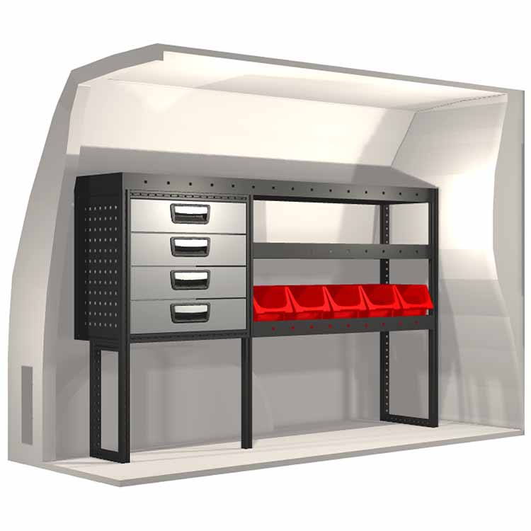 Ce système d’aménagement a été spécialement conçu pour assurer une adaptation optimale ainsi que la meilleure fonctionnalité et sécurité possible. Il a été développé pour un usage professionnel, est flexible et est destiné à des métiers de services dans des domaines variés. Toutes les étagères sont équipées de tapis caoutchouc, et tous les tiroirs de tapis mousse. Les composants d’assemblage et de fixation sont inclus.
