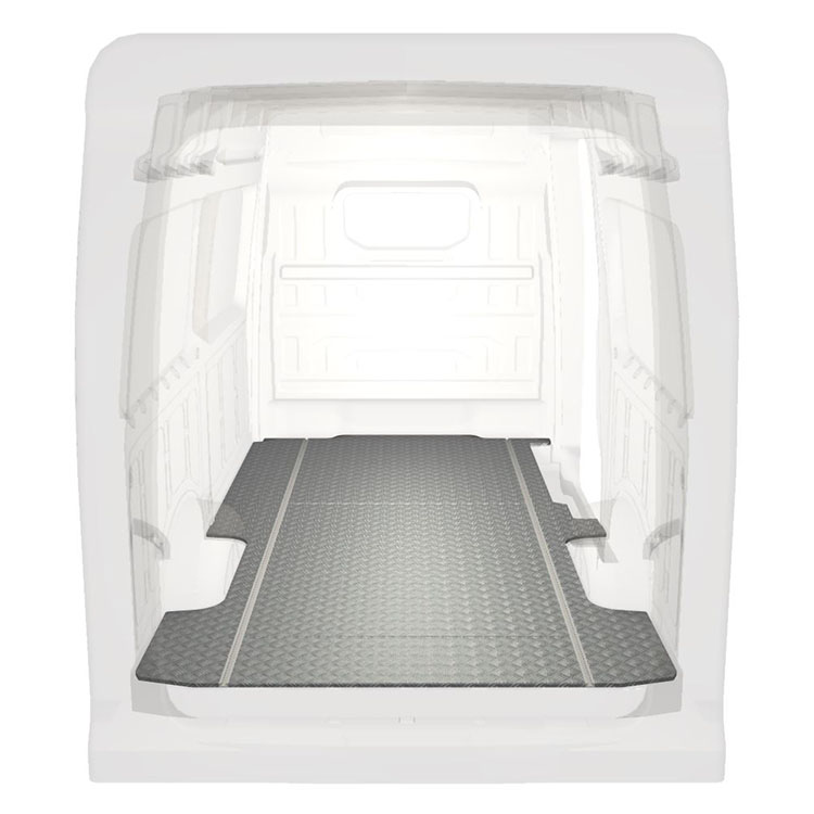 Plancher standard ultra-léger et robuste pour une Volkswagen Crafter / MAN TGE avec une plaque de roulement en aluminium antidérapant et des rails de chargement (longitudinaux) pour une installation rapide et sûre des systèmes de rayonnage et autres accessoires.