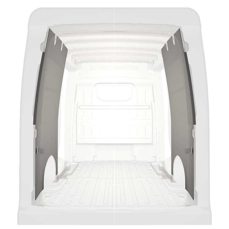 Revêtement entièrement léger pour les parois intérieures d’une Volkswagen Crafter / MAN TGE avec doubles portes latérales. Les parois créeront un environnement professionnel lumineux et convivial et se nettoient facilement.