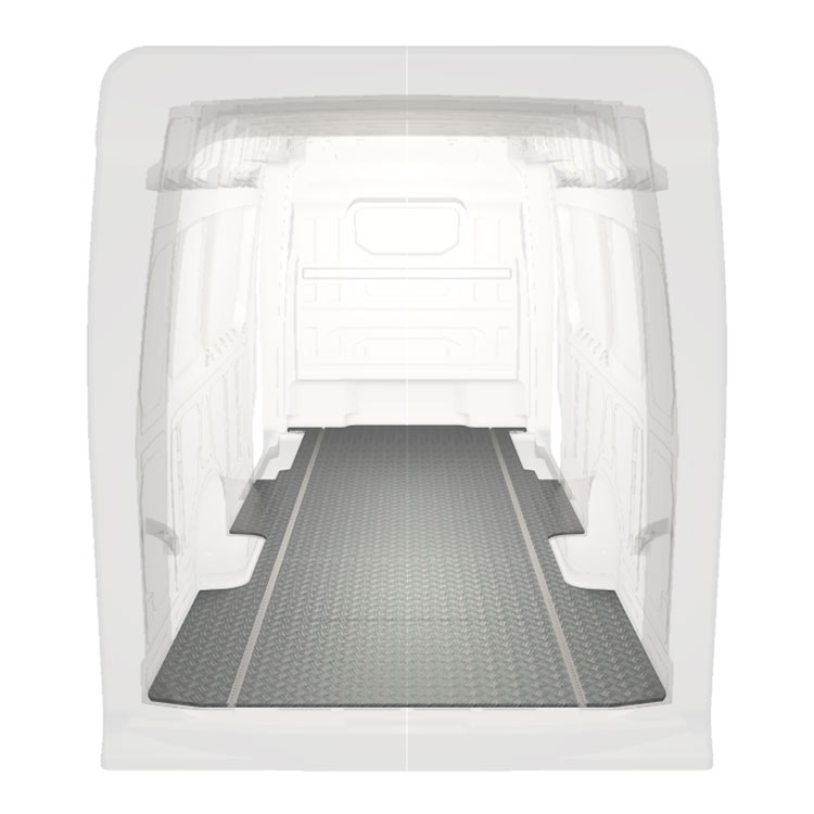 Plancher standard ultra-léger et robuste pour une Volkswagen Crafter / MAN TGE avec une plaque de roulement en aluminium antidérapant et des rails de chargement (longitudinaux) pour une installation rapide et sûre des systèmes de rayonnage et autres accessoires.