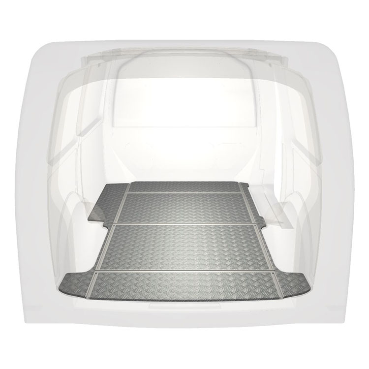 Plancher léger et robuste avec rails transversaux pour une Volkswagen Transporter T6 avec une plaque de roulement en aluminium antidérapant et des rails de chargement (longitudinaux et transversaux) pour une installation rapide et sûre des systèmes de rayonnage et autres accessoires.