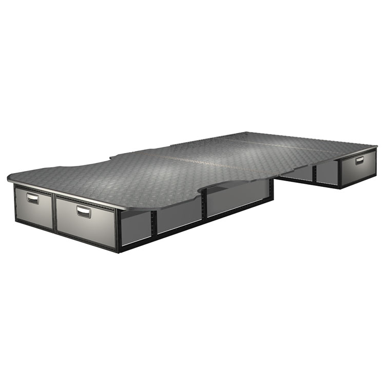The kit is designed to be fitted on top of a Modul-Floor, utilizing the floor rails for a non-intrusive installation. The double floor is equipped with rails for easy installation of vehicle racking, and edging strips for a nice finish.