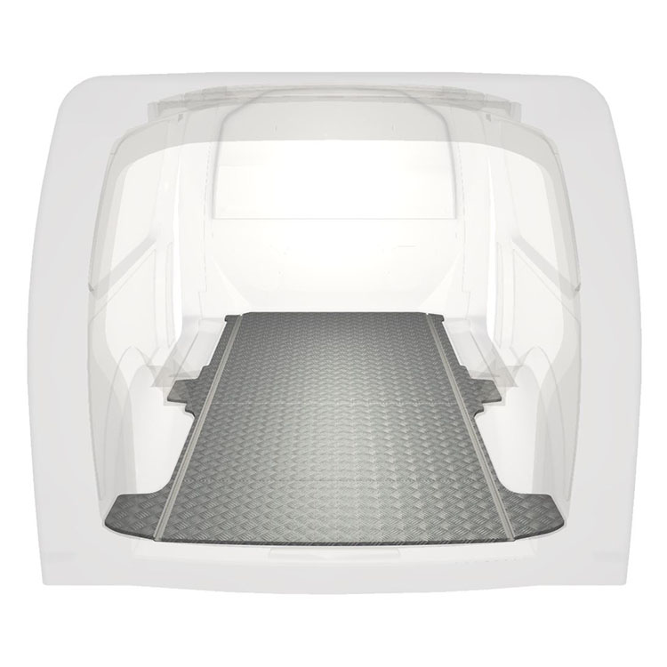 Plancher standard ultra-léger et robuste pour une Volkswagen Transporter T6 avec une plaque de roulement en aluminium antidérapant et des rails de chargement (longitudinaux) pour une installation rapide et sûre des systèmes de rayonnage et autres accessoires.
