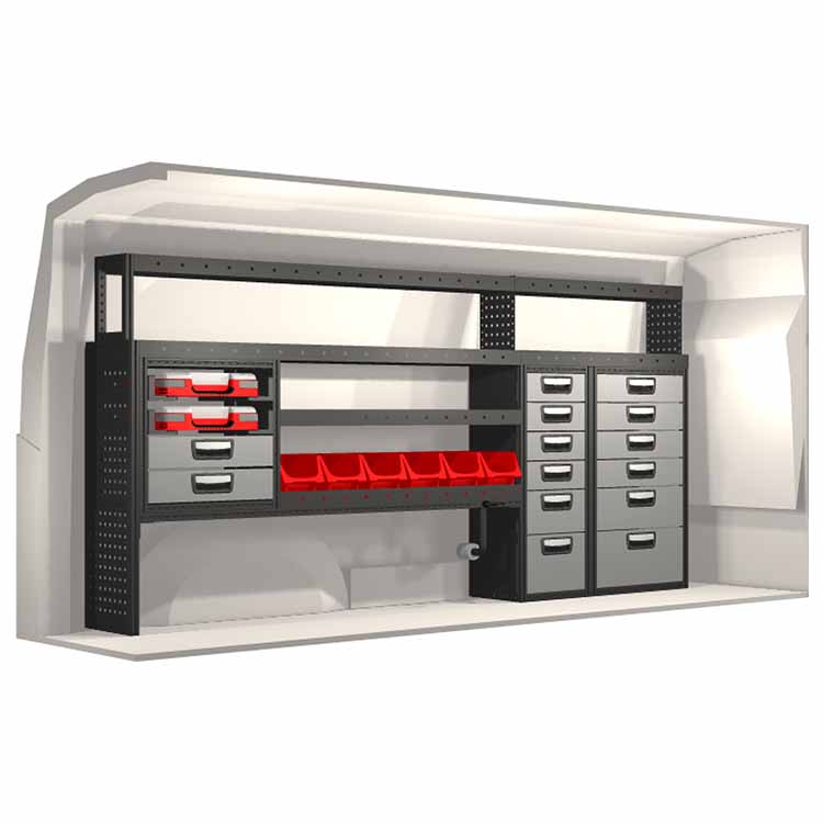 Ce système d’aménagement a été spécialement conçu pour assurer une adaptation optimale ainsi que la meilleure fonctionnalité et sécurité possible. Il a été développé pour un usage professionnel, est flexible et est destiné à des métiers de services dans des domaines variés. Toutes les étagères sont équipées de tapis caoutchouc, et tous les tiroirs de tapis mousse. Les composants d’assemblage et de fixation sont inclus.